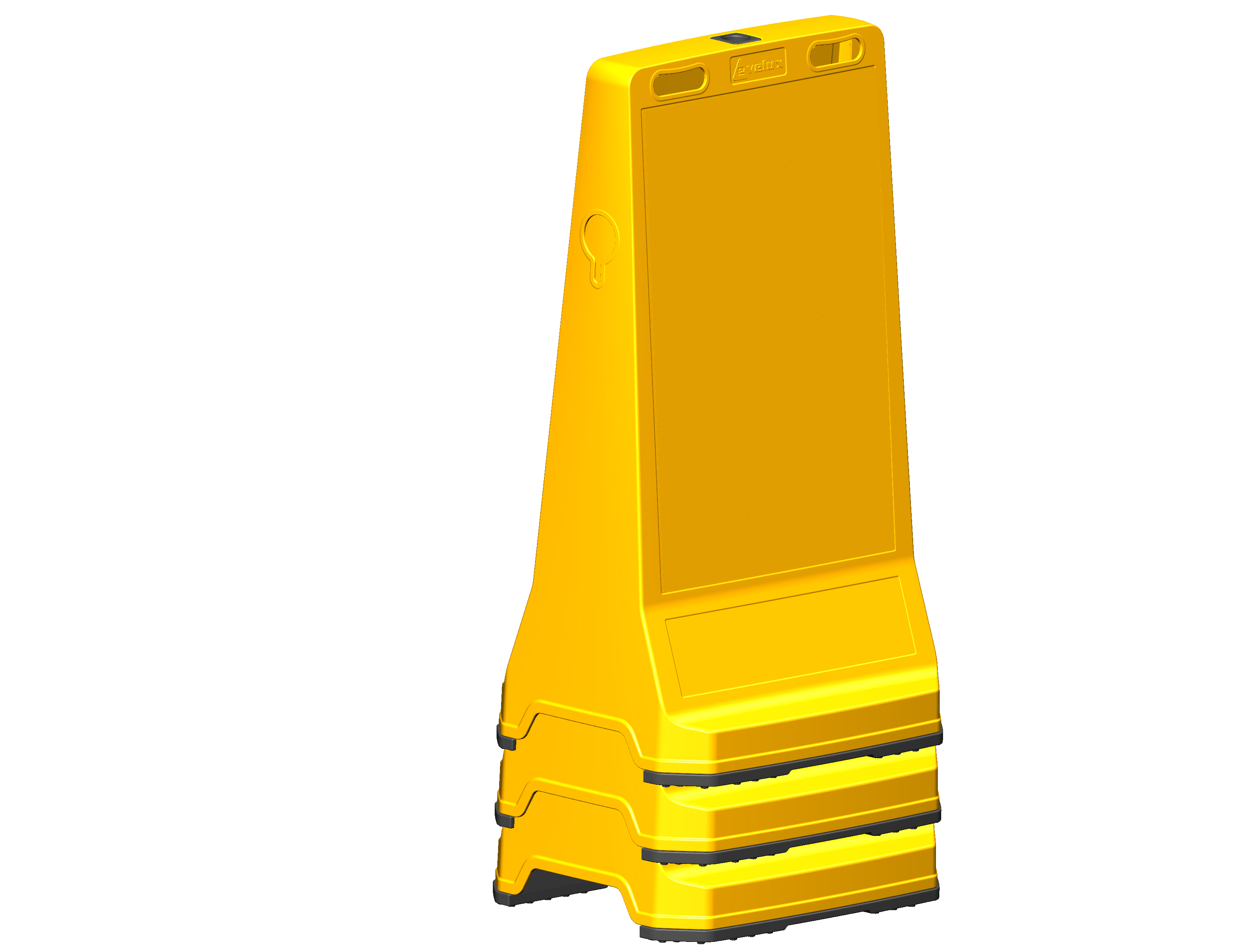 12429 DB A Signboard Advertising Barrier features an impact-resistant sturdy body and ergonomic hand grips for easy portability. Side chain passage channels allow secure attachment. Its weighted base provides high resistance to tipping. It supports various sign applications and customizable designs upon request. The grooved socket allows for the attachment of lamps and signs for enhanced visibility and warning. With a temperature resistance range of -20°C to +60°C, it is ideal for use on roads, in parking lots, and in any outdoor area for driver and pedestrian warnings and informational purposes.